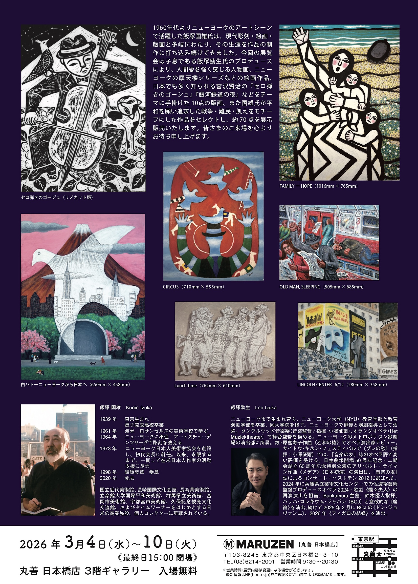 今回は子息の飯塚励生(れお)さんのプロデュースにより、人間愛を強く感じる人物画、ニューヨークの摩天楼シリーズなどの絵画作品、宮沢賢治(1896-1933)の童話「セロ弾きのゴーシュ」(1934年)や童話「銀河鉄道の夜」(1934年)などをテーマに手掛けた10点の版画、また、平和を願い追求した戦争・難民・飢えをモチーフにした作品を選んで約70点を展示販売する。